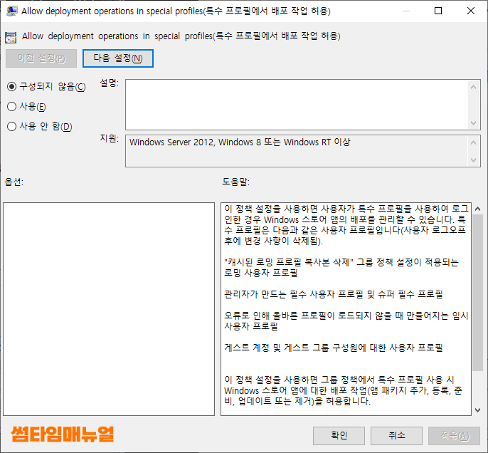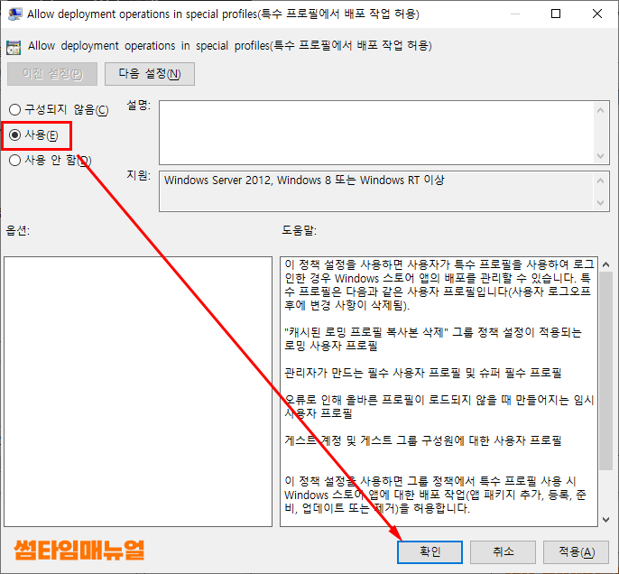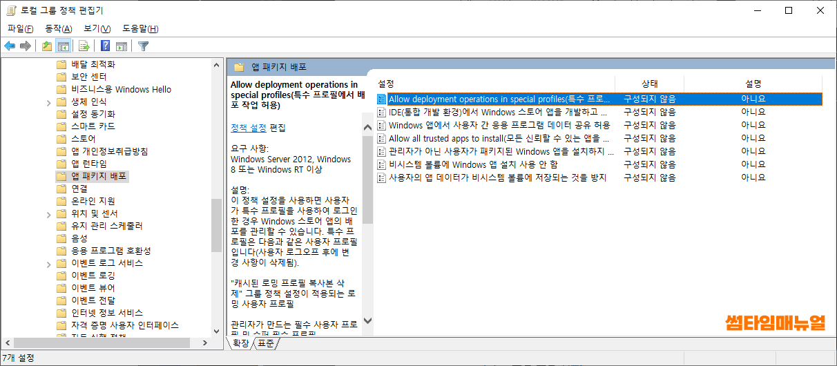 컴퓨터 구성 - 관리 템플릿 - Windows 구성요소 - 앱 패키지 배포 - Allow deployment operation in special profiles 선택
