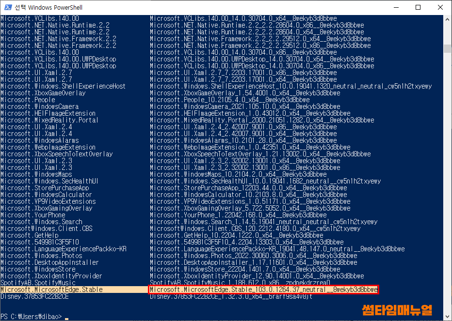 마이크로소프트 엣지를 제거하려면 패키지 명칭에 대해 확인하여야 하며 아래의 명령어를 입력하여 마이크로소프트 엣지의 버전을 알아 내도록 합니다