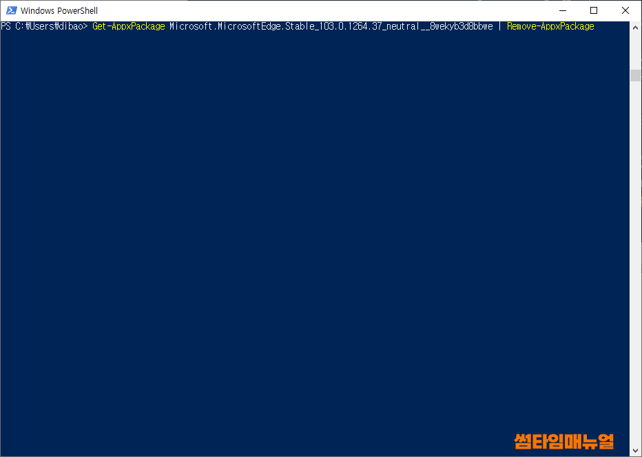 위의 빨강색 텍스트 부분은 앞서 위에서 확인한 패키지명칭을 대입해주도록 하며 패키지를 삭제하였다면 재부팅하여 엣지를 실행하도록 합니다