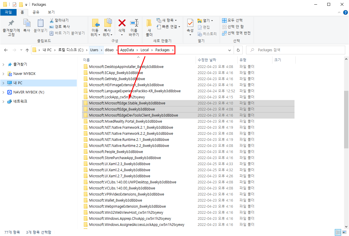 AppData - Local - Packages 폴더로 이동한 뒤 마이크로소프트 엣지와 관련된 패키지 파일을 모두 제거한 뒤 재부팅 하여 엣지가 실행되는지 체크하도록 합니다