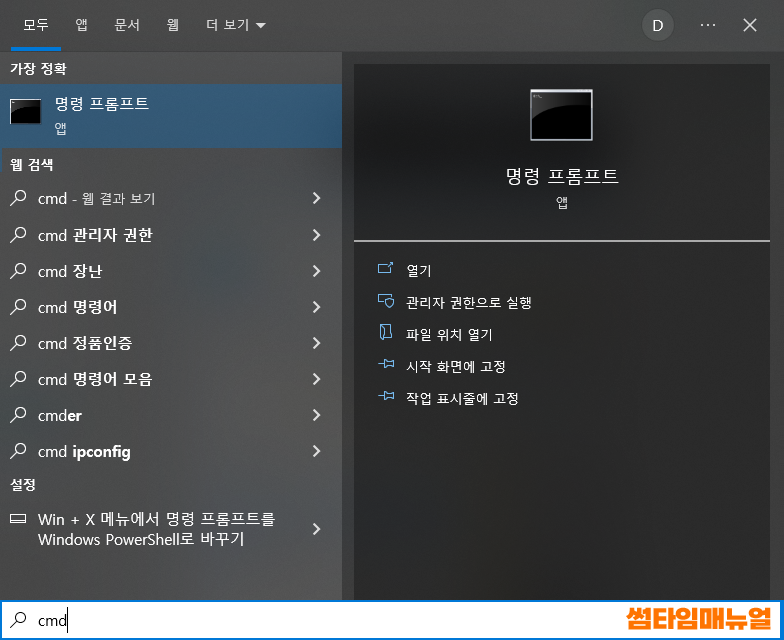 윈도우 키를 눌러 "cmd" 또는 "명령 프롬프트" 를 검색하여 "관리자 권한" 으로 실행합니다