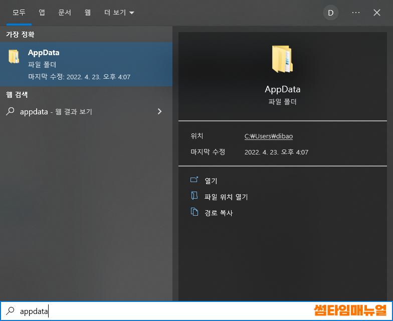 윈도우 키를 눌러 "appdata" 입력 후 폴더로 이동합니다