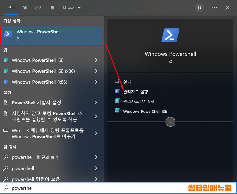 윈도우키를 눌러 "powershell" 검색 후 관리자로 실행하도록 합니다