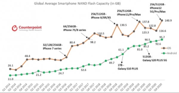 2020년 4분기 Android 기반 스마트폰은 평균 95.7GB의 용량을, iOS 기반 스마트폰은 평균적으로 140.9GB의 용량을 차지하고 있으며 이의 점유율 대비 사용용량의 평균수치를 비교해보면 100GB를 초과하는 용량수준으로 시간이 지나면 지날수록 점진적으로 평균 용량이 높아짐을 알 수 있습니다