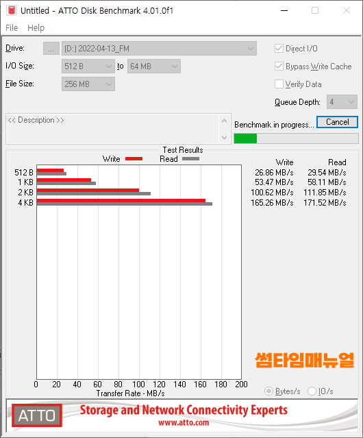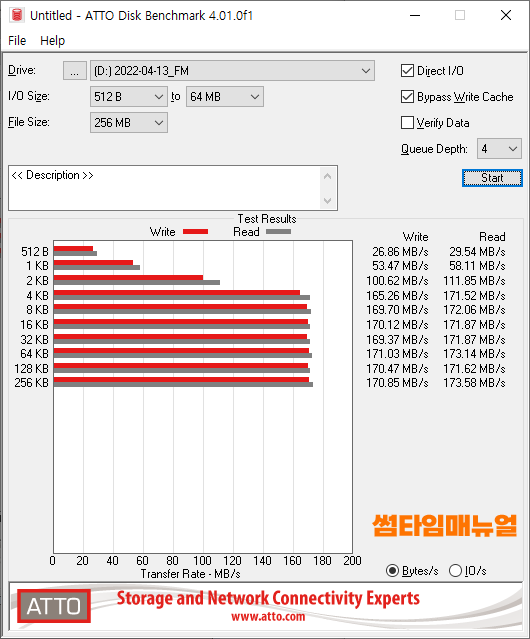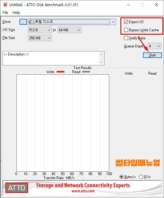 테스트를 위해서는 Direct I/O, Bypass Write Cache 항목을 체크하여 테스트를 진행하도록 하며 Start 버튼을 누르는 경우 읽기/쓰기의 성능이 체크됩니다