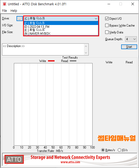 프로그램을 실행한다면 위와같이 드라이브 목록에서 테스트할 드라이브를 선택할 수 있어 테스트를 원하는 디스크를 선택하도록 합니다
