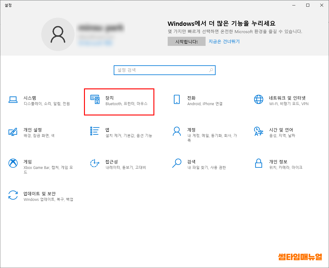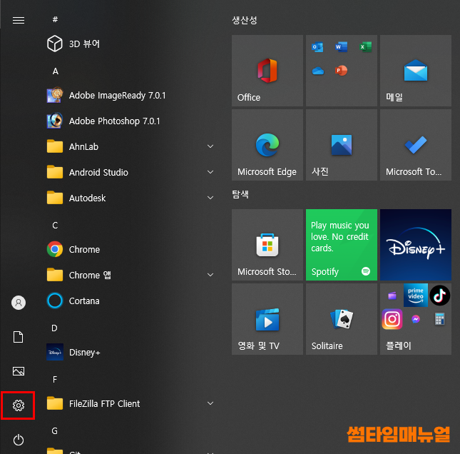 윈도우키를 눌러 설정 단축아이콘 인 톱니바퀴 버튼을 클릭합니다