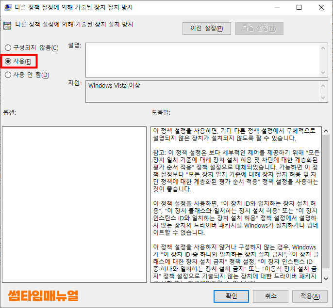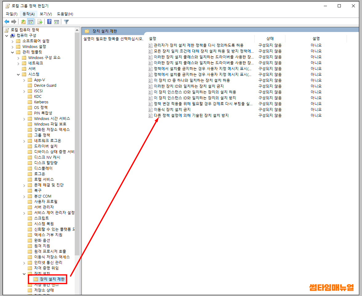 컴퓨터 구성 -> 관리 템플릿 -> 시스템 -> 장치설정 -> 장치 설치 제한 -> "다른 정책 설정에 의해 기술된 장치 설치 방지" 항목 선택합니다
