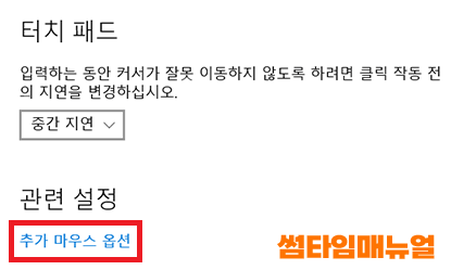 만약 터치패드의 사용, 끔의 설정이 보이지않는다면 "추가 마우스 옵션" 항목을 선택하도록 합니다