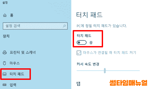 터치패드 항목에서의 터치 패드 사용설정이 있다면 "끔" 을 선택하여 줍니다