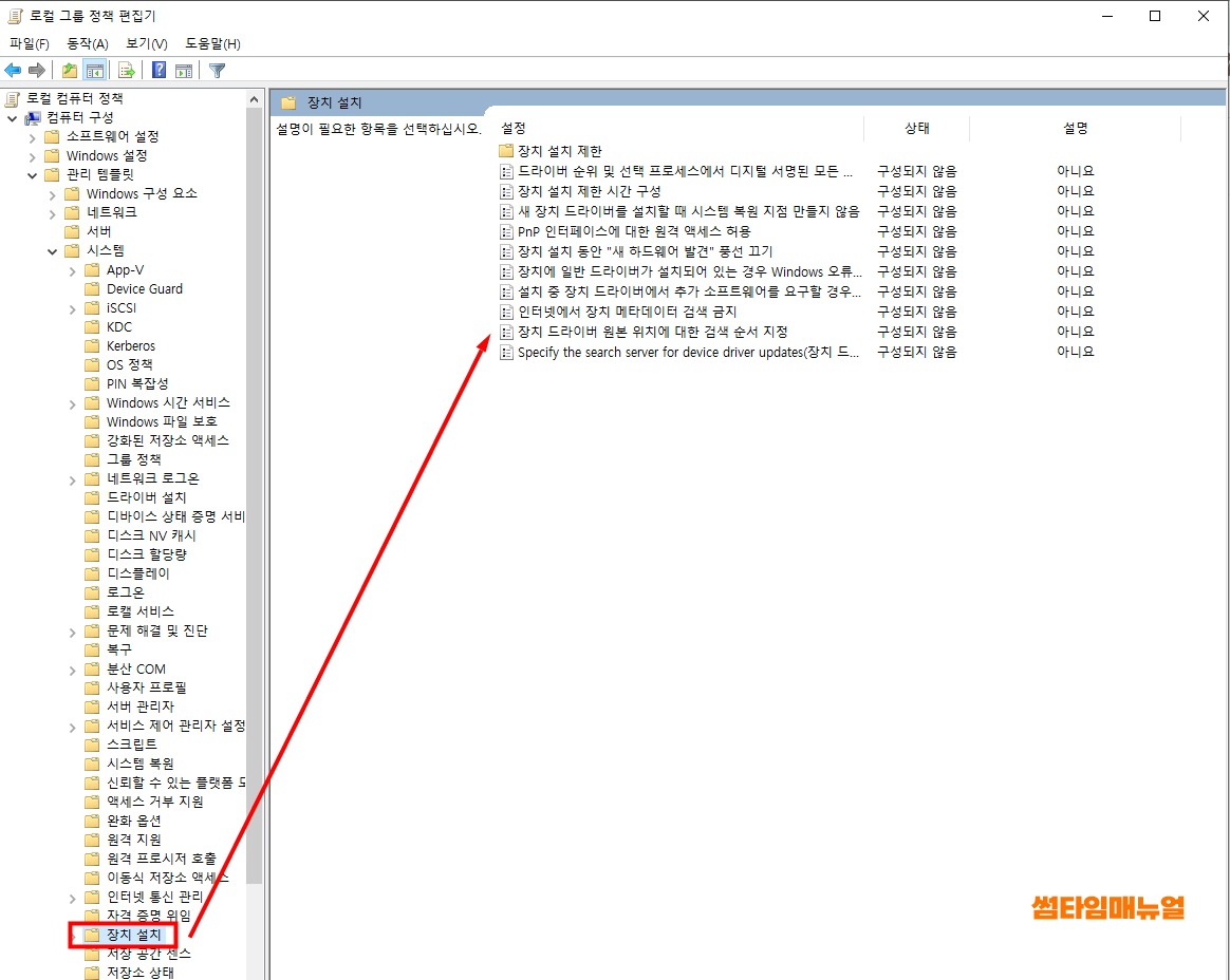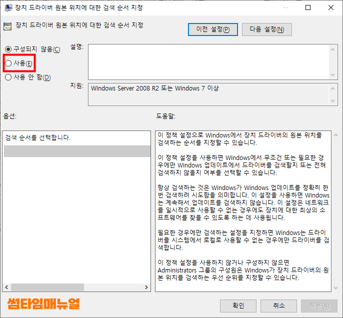 컴퓨터 구성 -> 관리 템플릿 -> 시스템 -> 장치설정 항목으로 이동해주도록 하며 "장치 드라이버 원본 위치에 대한 검색 순서 지정" 항목을 선택하여 구성되지 않음 선택값을 "안함" 설정으로 변경합니다