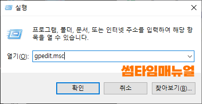 다음 로컬 그룹 정책 편집기의 단축어인 gpedit.msc 키를 입력해주도록 합니다