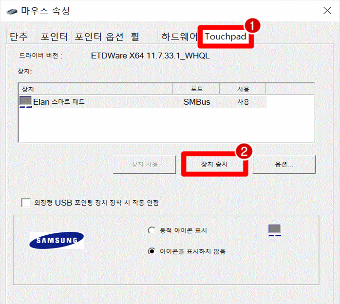 터치패드 탭에서의 "장치 중지" 를 선택합니다
