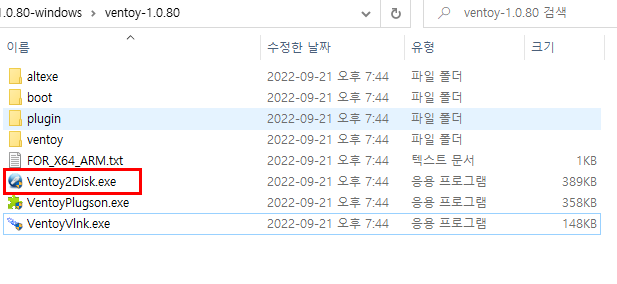 내부에는 Ventoy2Disk.exe 프로그램을 찾을 수 있으며 해당프로그램을 실행합니다