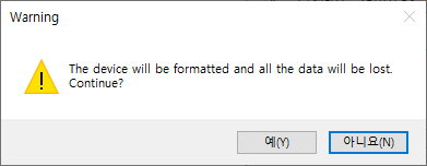 장치가 포맷되어 모든 데이터가 손실됩니다 계속하시겠습니까? 라는 의미이며 저장장치에 중요한 자료가 있는지 반드시 체크하도록 하고 중요한 자료가 없다면 "예" 버튼을 눌러 진행합니다
