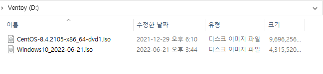 설치할 운영체제 파일을 위와같이 넣어주면 끝이므로 운영체제 재설치가 잦은 사용자의 경우 Ventoy를 이용하여 매번 굽는일 없이 간단하게 파일의 이동만으로 부팅디스크의 제작이 완료되며 만들어낸 부팅디스크를 부팅시에 데스크톱 바이오스 진입후 부팅순서를 방금만들어낸 Ventoy 저장장치를 1순위로 지정해준다면 간단하게 Ventoy 부팅 진입이 가능합니다
