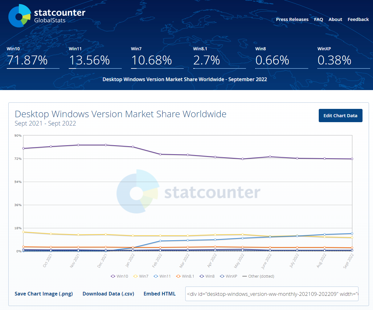 Windows 버전중에서도 Windows 10 버전의 사용량이 가장높으며 다음 Windows11, Windows7 등으로 사용량을 보여줍니다 (2022-10-25 일자 기준)