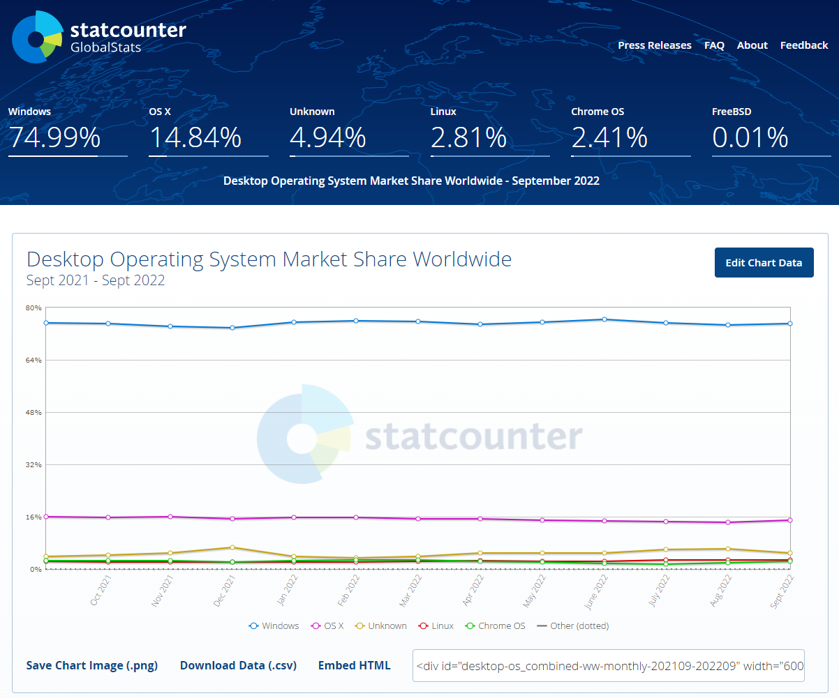 위의 표는 데스크톱에서의 운영체제 점유율을 나타낸 그래프로 Windows가 가장 압도적으로 높은 비중을 차지하고 있습니다