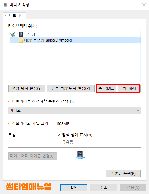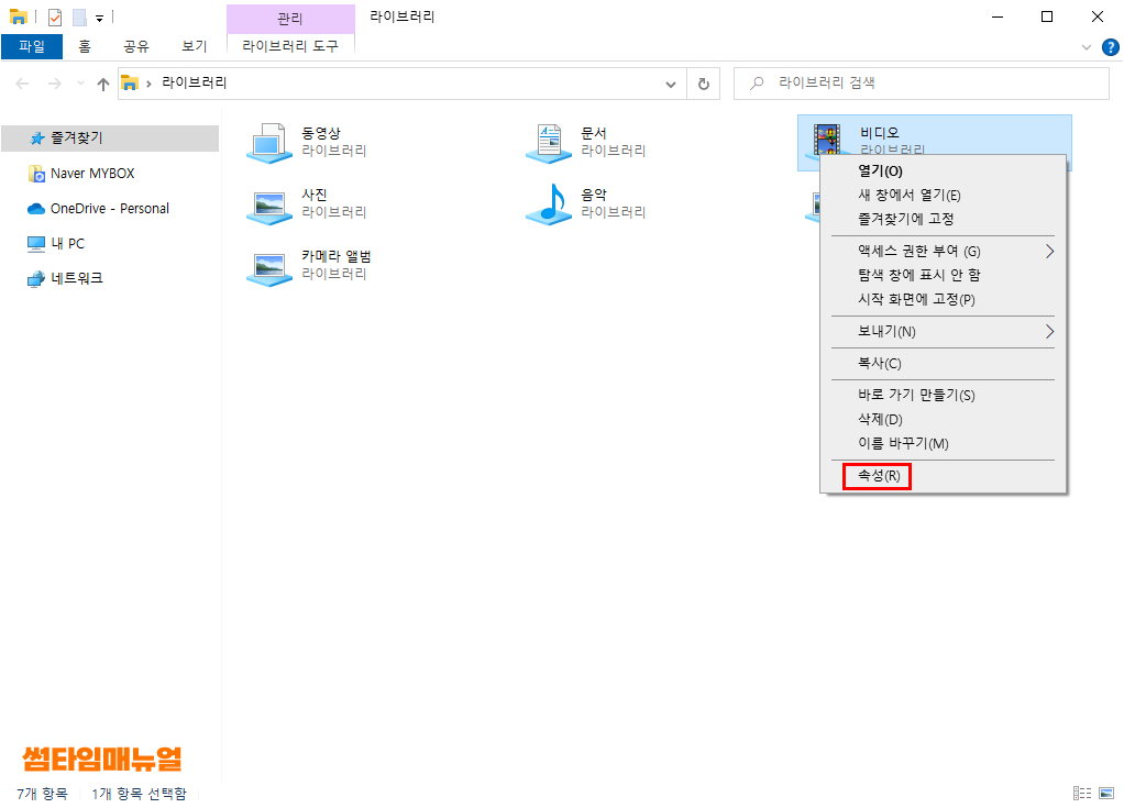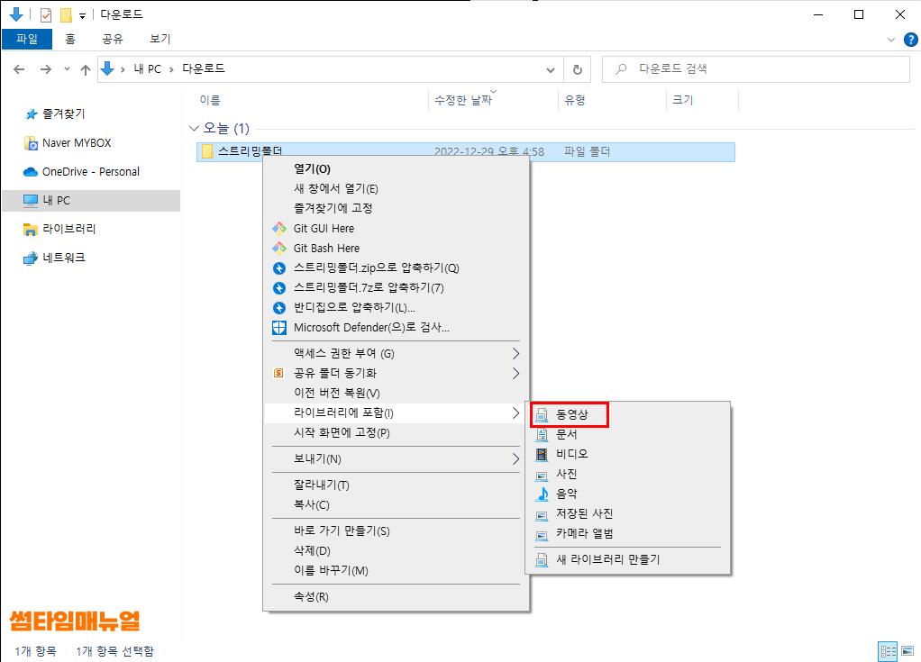 영상이 보관되어있는 폴더를 우클릭하여 라이브러리에 포함 -> "동영상" 항목을 선택합니다