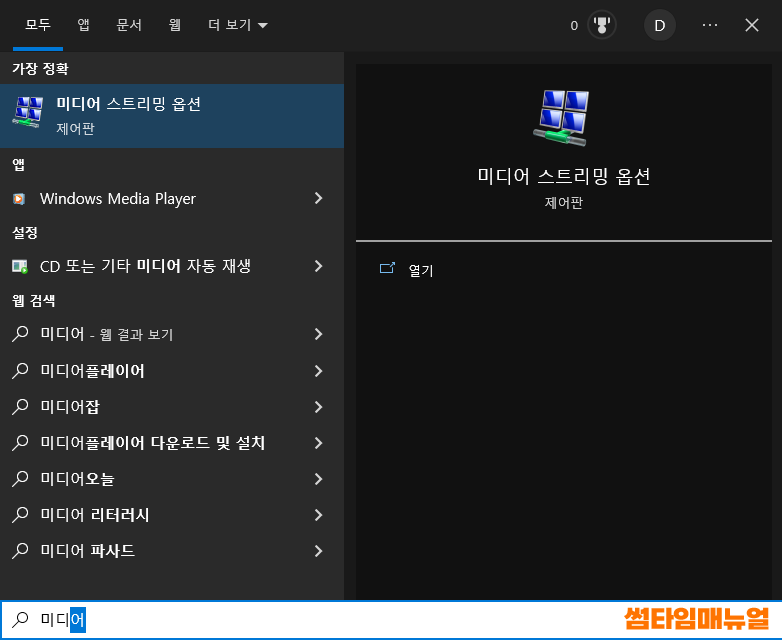 윈도우키를 눌러 윈도우즈 검색옵션을 열어주도록 하고, "미디어 스트리밍 옵션" 을 검색하여 위의 제어판 항목을 선택합니다