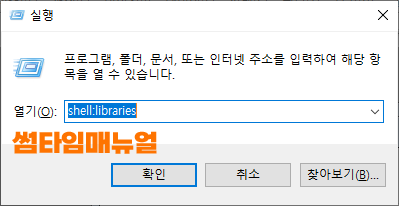 윈도우+R 버튼을 눌러 실행 커맨드를 실행하면 위와같은 팝업창이 확인되며 열기 항목에 shell:libraries 의 항목을 입력합니다