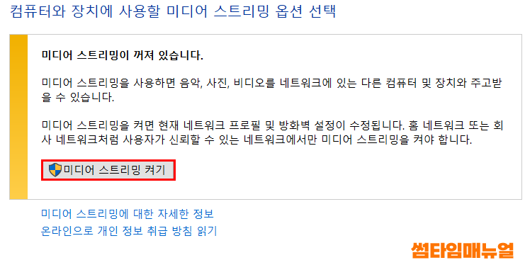 미디어 스트리밍 켜기 버튼을 클릭하여 DLNA 서버를 활성화 합니다