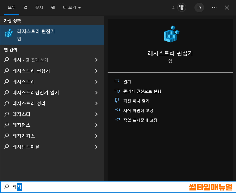 윈도우 검색창을 통해 "레지스트리 편집기" 를 입력하여 검색또한 가능합니다