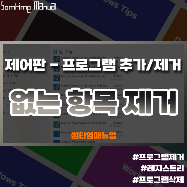 삭제를 희망하는 경우 프로그램을 선택하도록 하고 "제거" 버튼을 클릭하여 손쉽게 제거가 가능하지만 알 수 없는 문제로 인해 앱 및 기능 내 프로그램이 확인되지않거나, 바이러스에 감염되거나 제거 버튼을 눌렀음에도 제거가 되지않는 문제가 발생되는 경우 레지스트리를 강제로 제거하여 프로그램을 제거할 수 있습니다