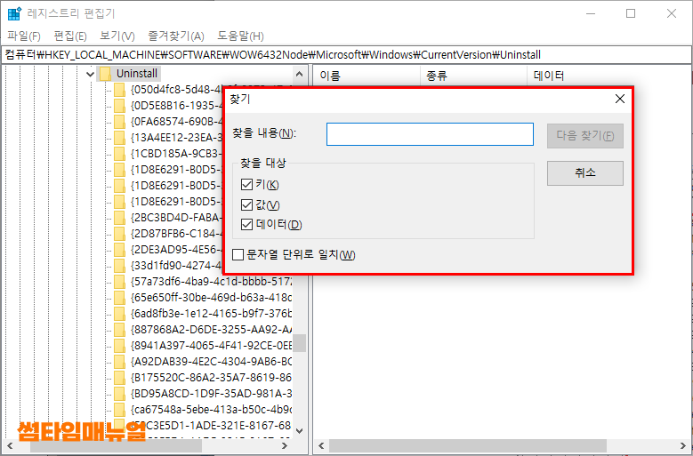 Ctrl+F 버튼의 단축키를 눌러 "찾기" 팝업창을 열어주도록 하고 특정 프로그램을 제거시에 검색하여 손쉽게찾아낼 수 있습니다