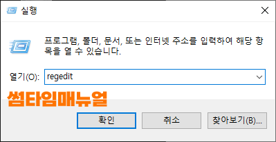 키보드 윈도우버튼 + R 의 단축키를 눌러 "실행" 팝업창을 실행하도록 한 뒤 "regedit" 명령어를 입력하여 레지스트리 편집기를 실행합니다