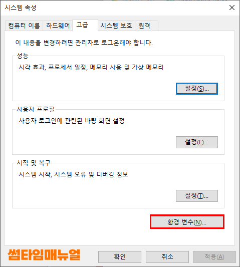 시스템 속성 팝업창에서 하단부분에서의 "환경 변수" 항목을 선택합니다