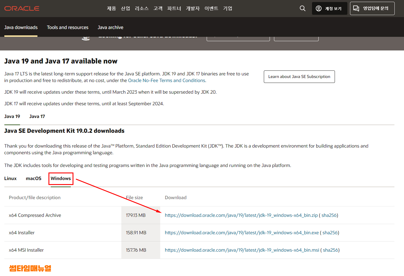 https://www.oracle.com/kr/java/technologies/downloads/#java19