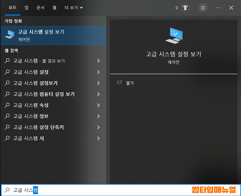 제어판 항목인 "고급 시스템 설정 보기" 항목을 찾아 선택합니다