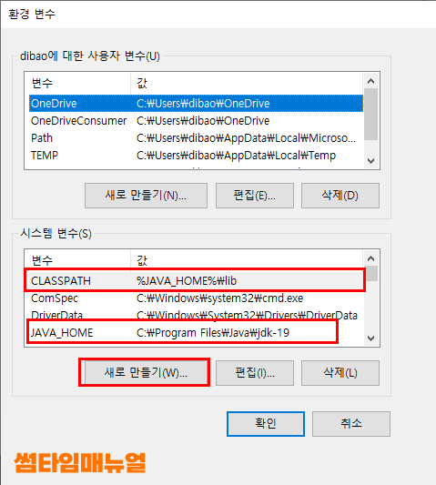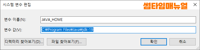 | JAVA_HOME | C:\Program Files\Java\자바버전 ex) C:\Program Files\Java\jdk-19 |