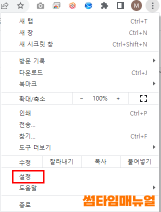 크롬 브라우저의 우측 상단 "설정" 버튼을 선택합니다
