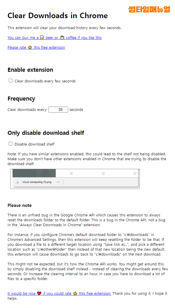 소개되는 확장 프로그램은 Clear Downloads in Chrome 프로그램으로 크롬브라우저내에서 다운로드가 이뤄진 경우 하단에 다운로드 바가 생성되는것을 확인할 수 있는데 해당 창을 일일히 닫아주지 않더라도 설정한 시간때가 지나면 자동으로 닫아주는 기능을 제공하는 프로그램입니다