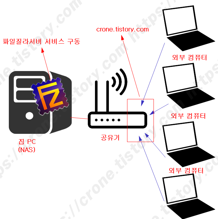 우리의 목적은 외부 컴퓨터로부터 공유기를 지나서, 집PC의 파일질라서버까지 도달하여 자료를 꺼냈다, 저장했다 수정하기 입니다