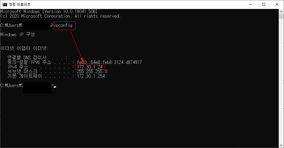 ipconfig 를 입력하여 현재 할당되어있는 ip주소를 확인합니다