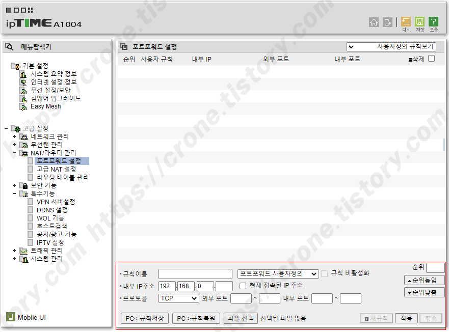 그리고 다음 포트포워딩 메뉴로 이동하여 포트포워딩 진행하도록합니다.