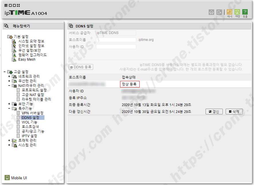 (입력한호스트이름.iptime.org 는 앞으로 사용될 도메인이되므로 꼭 기억하기 편한 도메인주소를 입력합니다.)