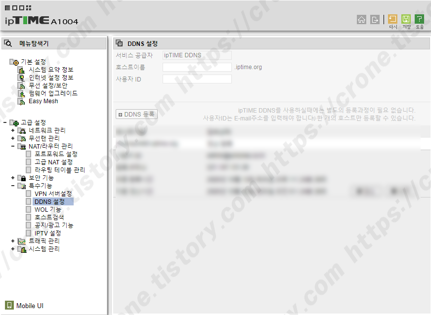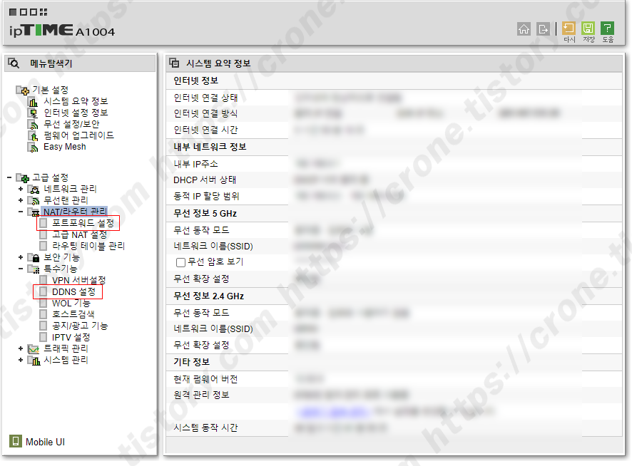 좌측메뉴에 보면 포트포워딩 설정 메뉴와, DDNS설정 메뉴가 확인됩니다.