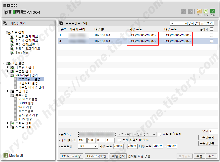 위와같이 외부포트,내부포트를 설정하여주시면 설정은 끝입니다.