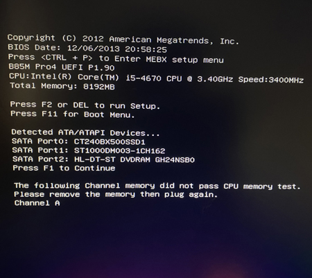 데스크톱을 초기 부팅하게되면 메인보드에서 CPU부터 메모리, 하드, SSD 등 연결되어있는 모든 장치에대해서 정상연결되었는지 체크를 하게됩니다, 이때 메모리에 문제가 생긴경우 위와같은 화면이 확인되게 됩니다