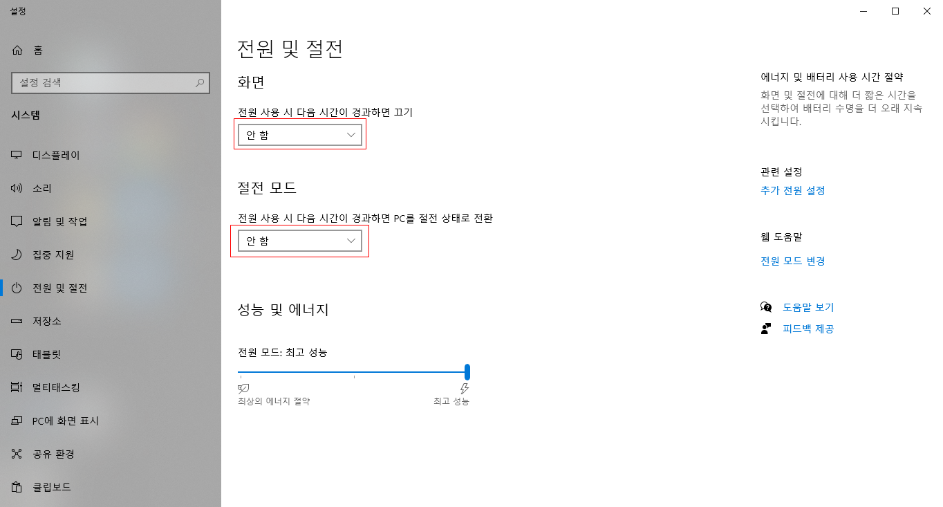 저는 화면이꺼지는것도, 절전모드도 원하지않아 "안함"으로 설정하였습니다.