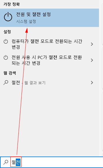 윈도우 키를 눌러 "절전" 입력후 전원 및 절전 설정 설정으로 이동합니다