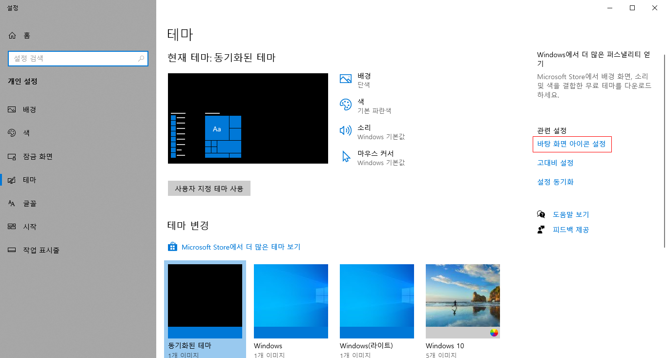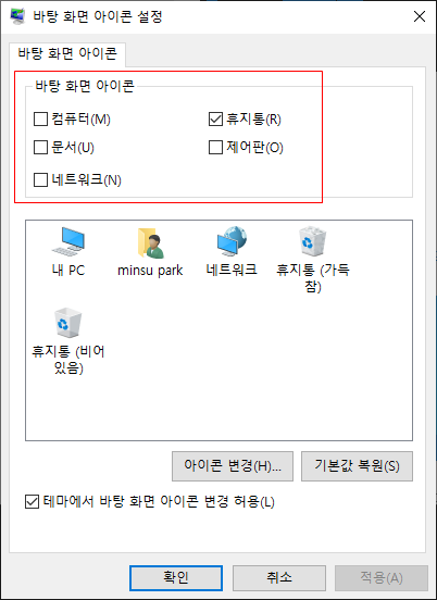 바탕화면 아이콘 설정 버튼을 누릅니다